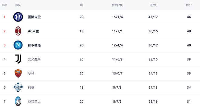 意甲最新积分战报 国米8轮不败6分优势领跑 那不勒斯追上AC米兰