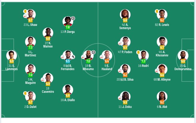 曼城首发:25-多纳鲁马、6-阿克、45-胡桑诺夫、68-阿莱恩(46’33-奥赖利)、82-刘易斯、16-罗德里、20-B席(81’4-赖因德斯)、42-塞梅尼奥、9-哈兰德(81’63-穆卡萨)、11-多库(81’21-努里)、47-福登(46’10-谢尔基)。