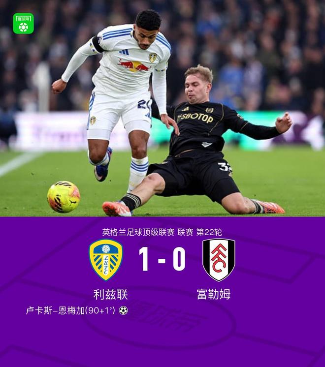 第90+1分钟,恩梅加倒地情况下扫射破门,利兹联1-0富勒姆