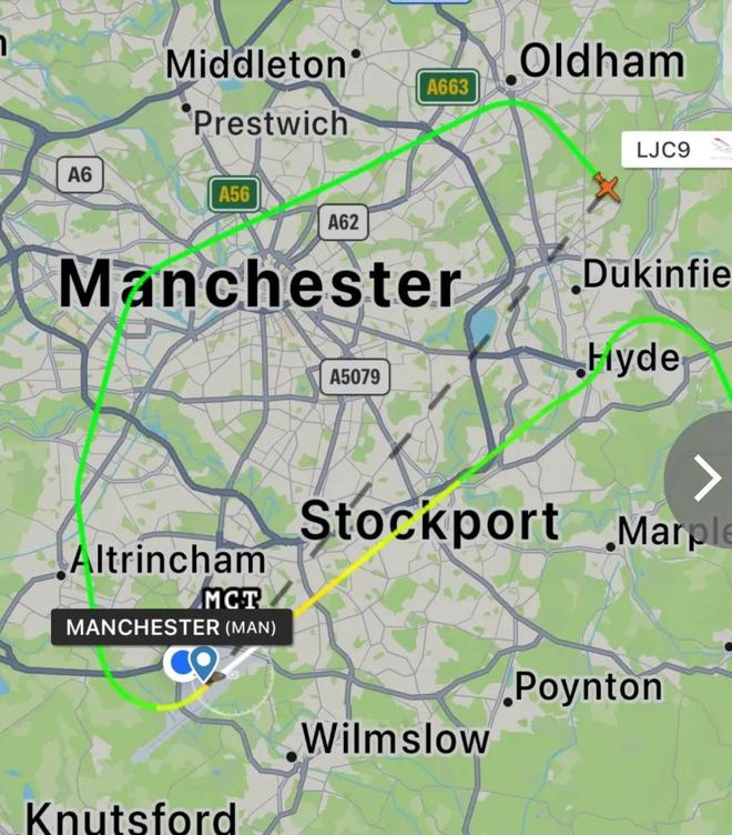 但据《太阳报》报道,在降落前,格伊的飞机遇到了突发状况,原定的降落计划临时取消,飞机飞越曼彻斯特机场后在市中心盘旋。