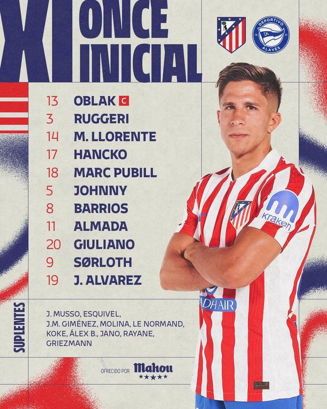 马竞vs阿拉维斯:胡利安-阿尔瓦雷斯、奥布拉克首发,阿莱尼亚、洪尼-奥托出战