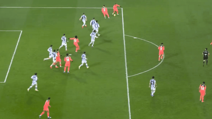 佩德里屡遭凶狠的犯规,但是裁判始终无动于衷。孔德门前头球,重重击中横梁弹出!第88分钟,索莱尔飞铲佩德里,裁判经过视频回放鉴定后,直接红牌罚下。经过长达9分钟的补时,最终10人的皇家社会守住了胜局。