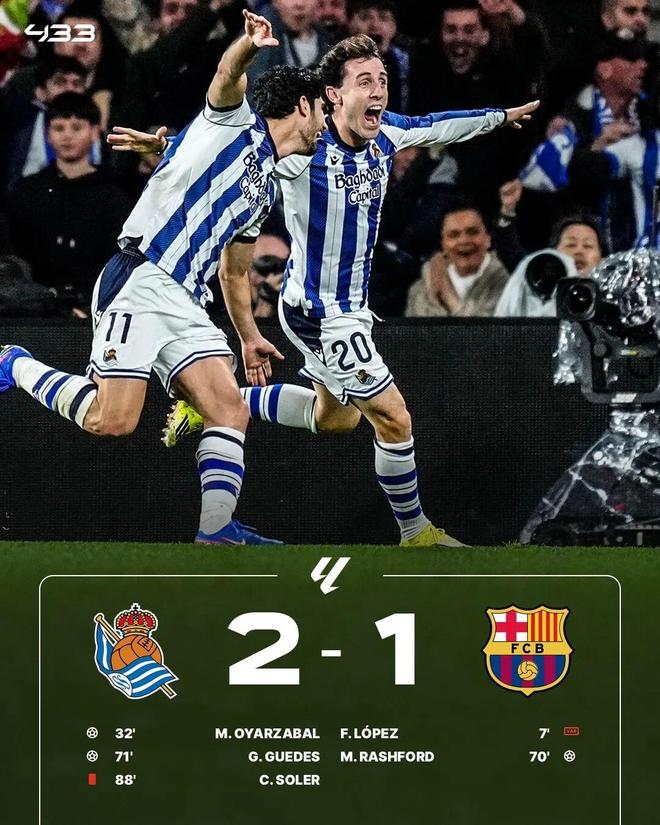 西甲第20轮,皇家社会主场对阵巴萨。比赛上半场,奥亚萨瓦尔凌空抽射破门。易边再战,下半场,亚马尔助攻,拉什福德扳平。不过,格德斯很快便抽射得分,帮助皇社再次领先。