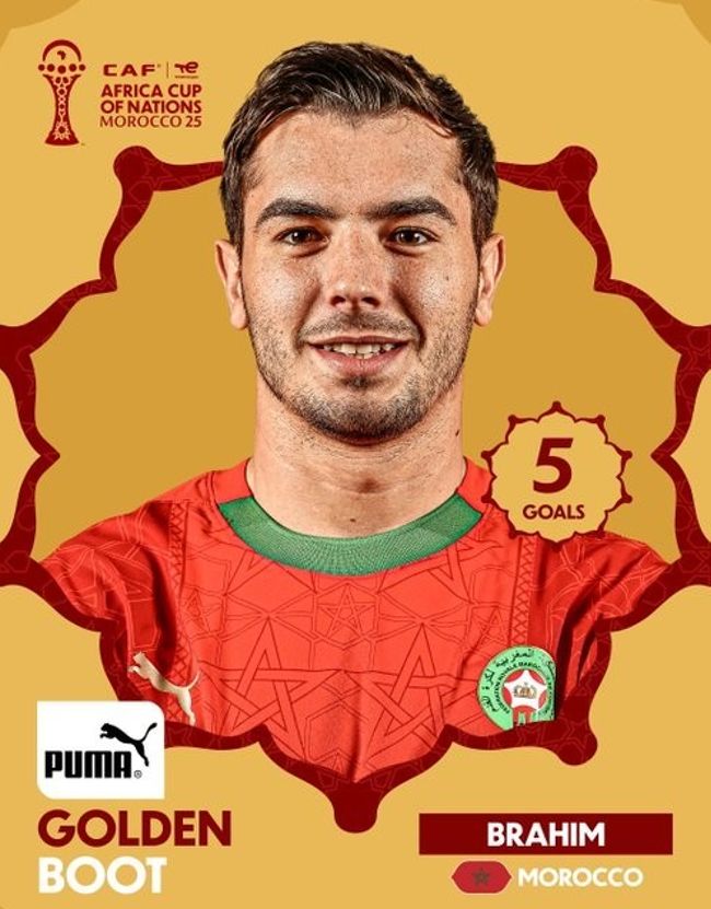 本届非洲杯,摩洛哥前锋卜拉欣-迪亚斯以5粒进球当选本届非洲杯最佳射手。