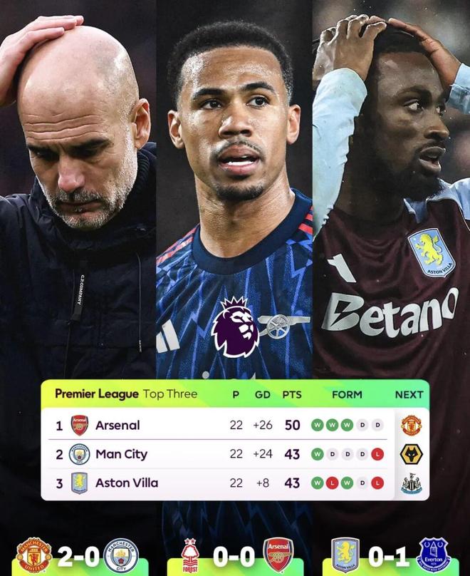 原本有望缩小分差的维拉,主场面对埃弗顿时未能延续强势表现,在全场狂轰18脚的情况下,0-1负于埃弗顿,两轮不胜后与阿森纳的分差同为7分。两大竞争对手同时输球,让阿森纳在两连平的情况下意外多出了1分的领跑优势。