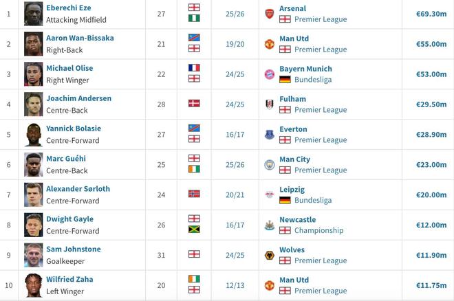 德转统计水晶宫队史出售球员身价TOP10: