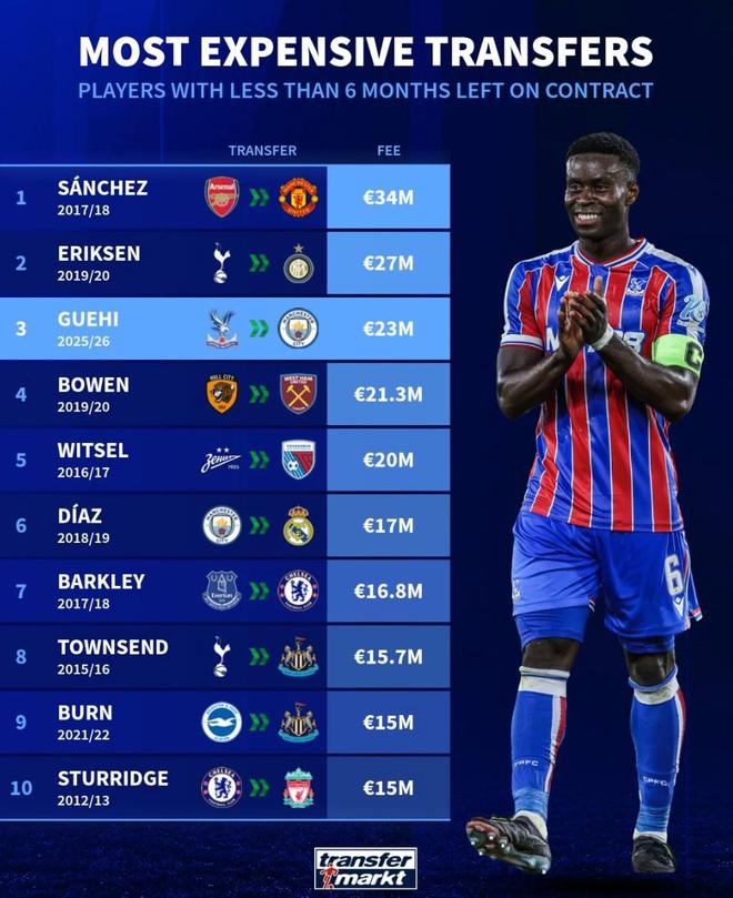 3. 格伊 25-26赛季 水晶宫>>曼城 2300万欧元