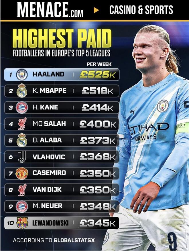 欧洲五大联赛周薪最高球员!姆巴佩周薪485万只排第二 莱万323万