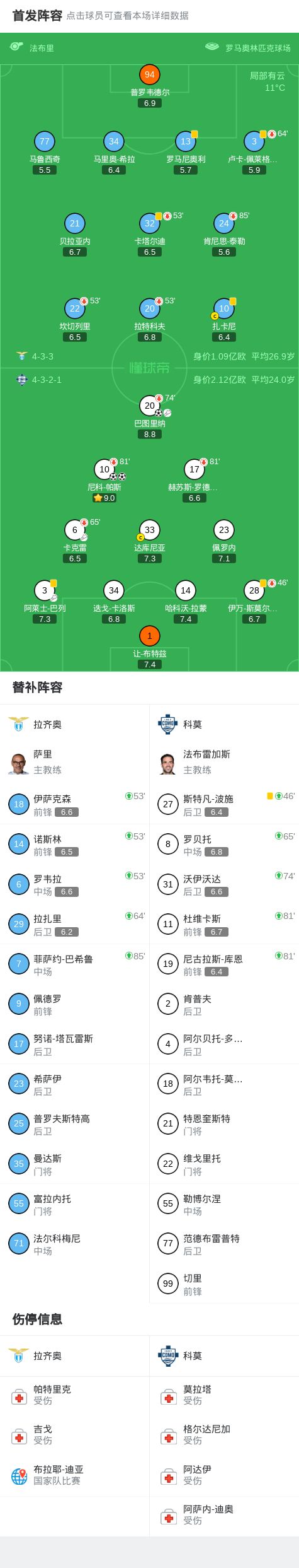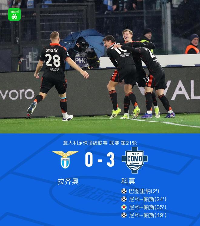 拉齐奥0-3科莫,尼科-帕斯双响+失点,巴图里纳传射建功