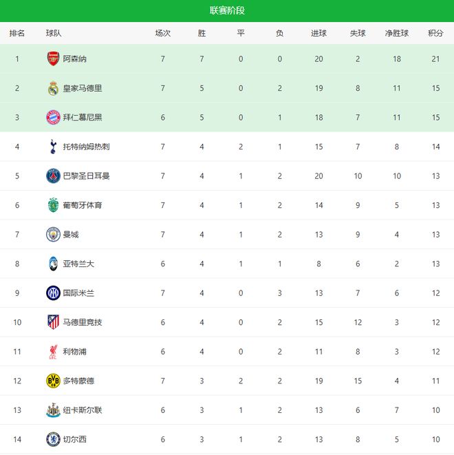 随着皇马6-1+阿森纳3-1!欧冠最新积分榜:曼城爆冷,2-11名差3分
