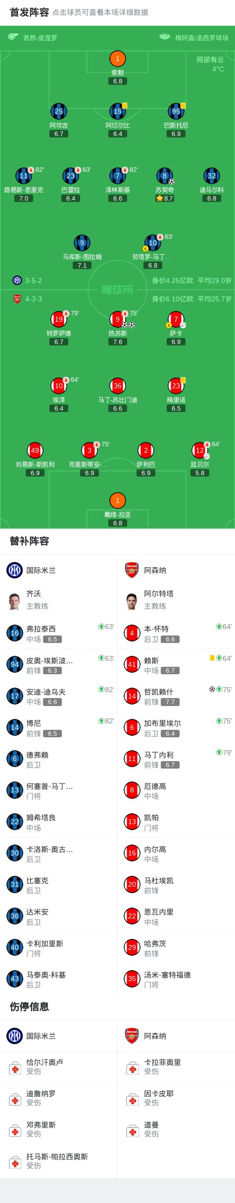 北京时间1月21日4:00,欧冠联赛阶段第7轮焦点战,国际米兰坐镇梅阿查球场迎战阿森纳,本场主裁判为皮涅罗。上半场,热苏斯头顶脚踢上演梅开二度,苏契奇轰世界波。下半场,哲凯赖什替补登场兜射锁定胜局。最终,阿森纳3-1客胜国米。